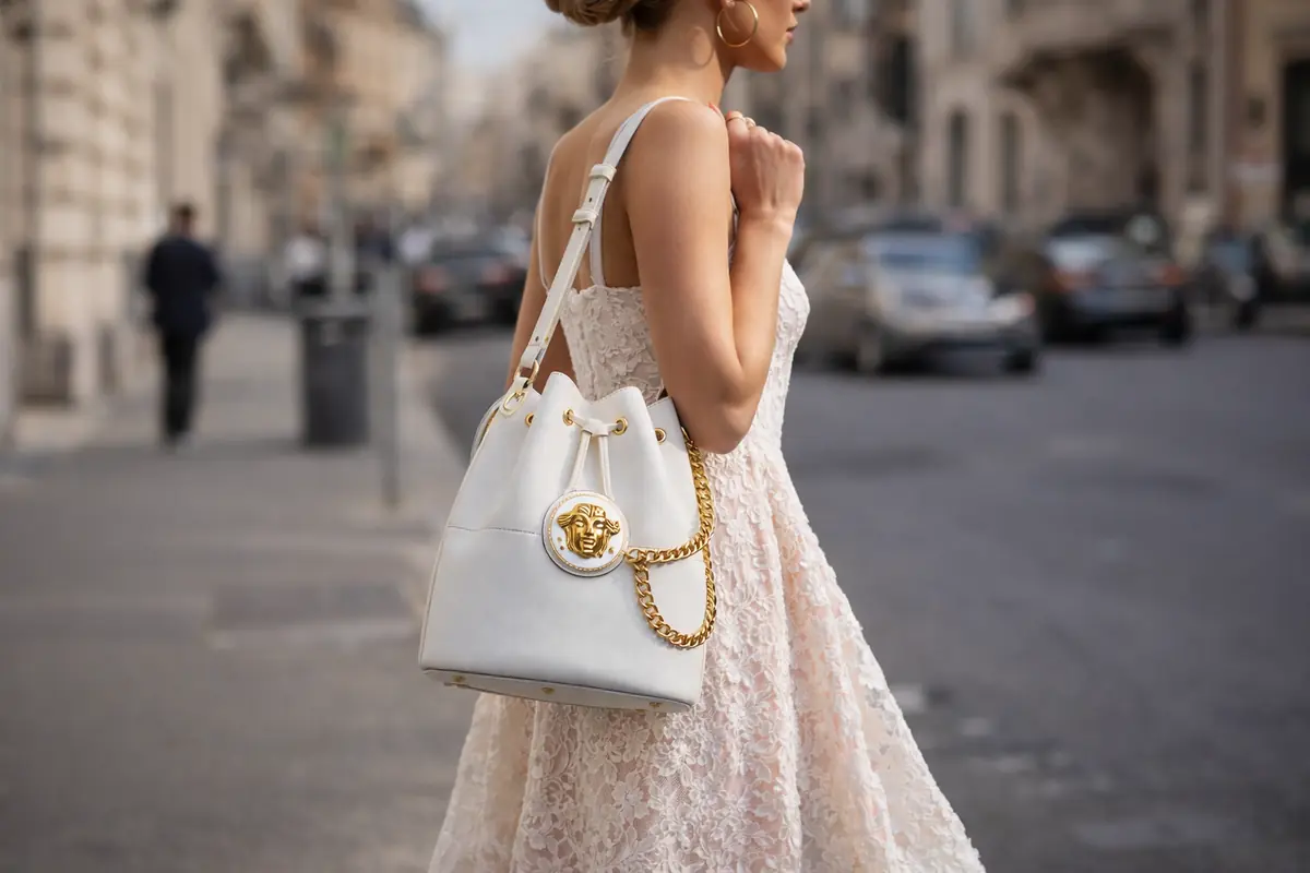 Tra le versioni più riconoscibili c’è quella proposta da Versace. La casa italiana ha presentato la nuova Pivot, una bucket bag in pelle con dettagli metallici e l’iconica Medusa applicata come un cameo. La struttura rimane pratica, ma il risultato è decisamente scenografico.