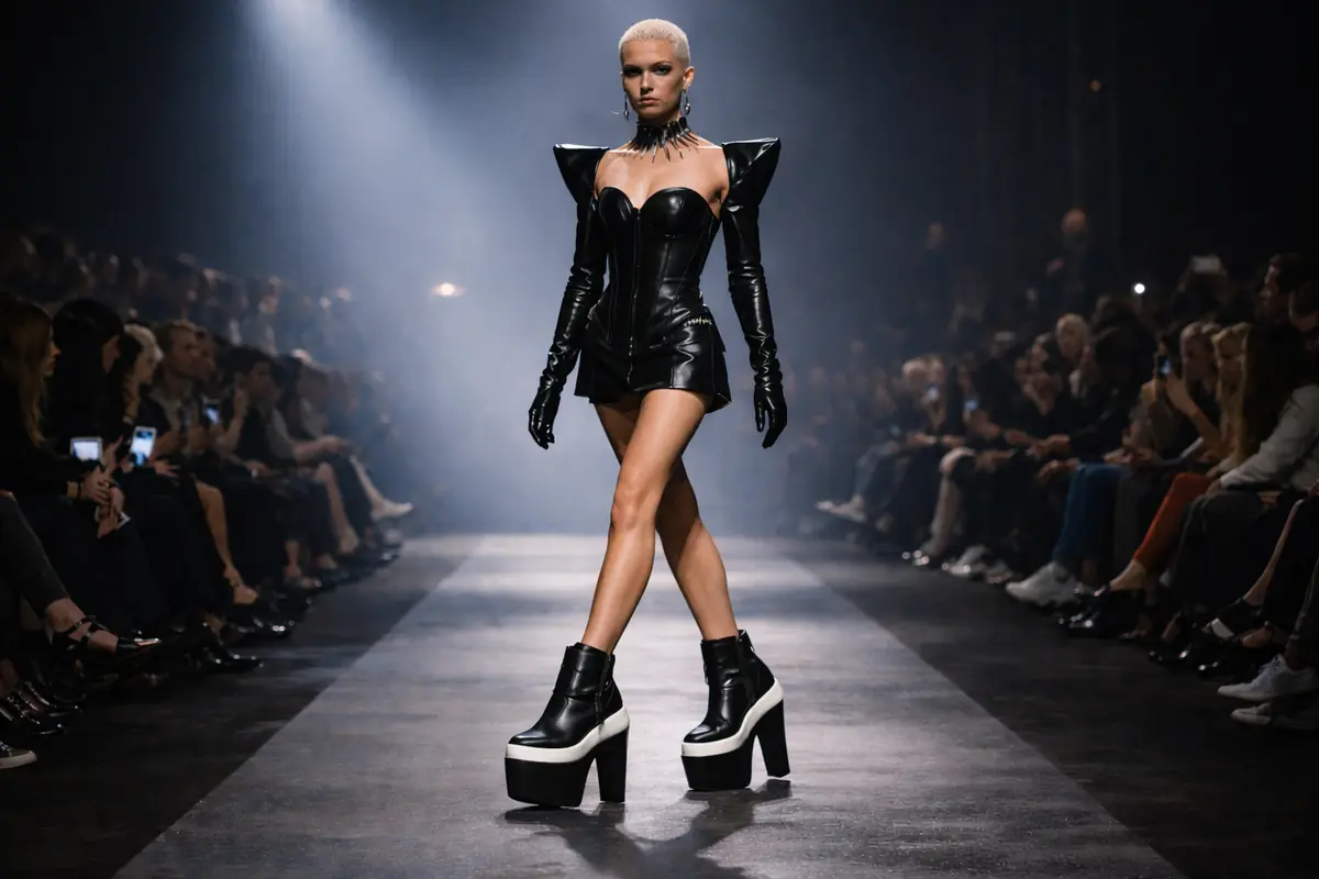 Quando la sfilata è iniziata, l’atmosfera era già carica di aspettative. In passerella sono apparsi abiti teatrali, accessori provocatori e simboli di potere che trasformano la collezione in una vera performance artistica.